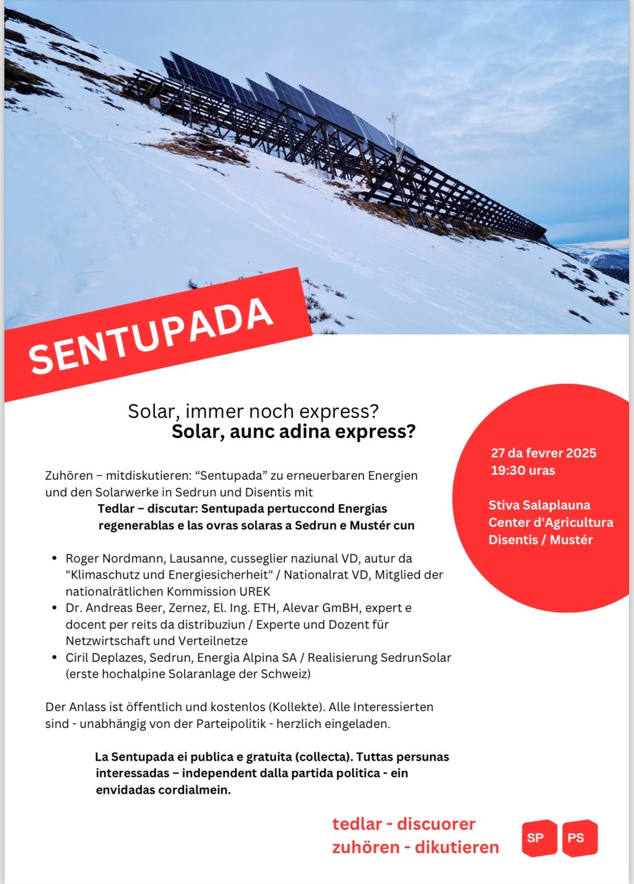 Die zahlreich erschienen Besucherinnen und Besucher durften sich auf einen informativen und hochspannenden Abend freuen. Sie wurden nicht enttäuscht! Nach einer kurzen Begrüssung durch Silvio Capeder und Heiner Hochreutener von der Genossenschaft OptimaSolar Surselva, fesselte Walter Sachs, Präsident Schweiz. Vereinigung für Sonnenenergie SSES, die Anwesenden mit seinen Ausführungen zum Thema «Das Solarpotential und seine Zukunft». Mit seinem Vortrag ist es Walter optimal gelungen, bei...